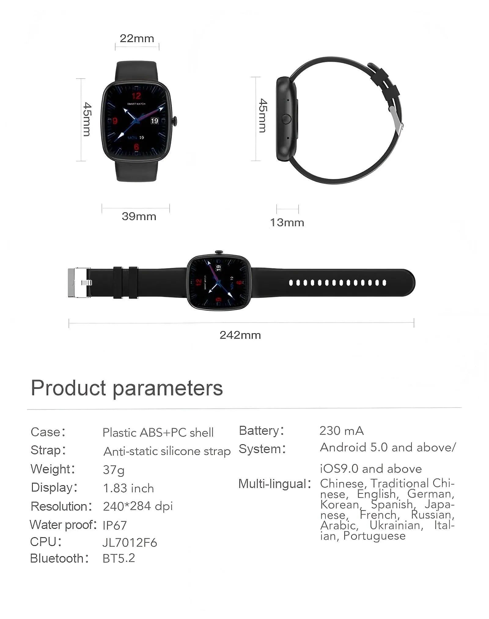 Elevate your lifestyle with the Amovan Smart Watch Z139. Featuring a 1.83-inch HD touchscreen, enjoy crystal-clear notifications and seamless interactions. With 64MB memory and a high-performance chip, experience fast, smooth operation. Stay connected with instant call and message alerts, ensuring you never miss a moment. Track your health with 24/7 heart rate monitoring and sleep monitoring to optimize your wellness. Choose from 100+ stylish dials and 130+ sports modes to personalize your look and fitness routine. With IP67 waterproofing and long battery life, it’s perfect for any adventure.